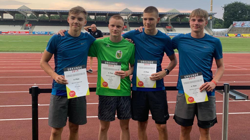 Wir gratulieren Niklas Uth (SV Lindenau), Piet Enzmann, Vincent Benedix und Ron Martin zum 4. Platz der 4x100m-Staffel der StG Leipzig der U18 bei den DJM ! Vielen Dank auch an unseren Ersatzläufer Niklas Weber der "Gewehr bei Fuß" gestanden hat und jederzeit hätte einspringen können.