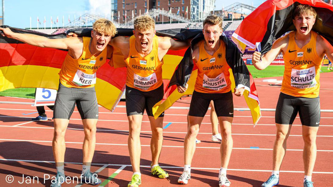 Eine starke Mannschaftsleistung der deutschen Sprinter wurde am Sonntag bei der U20-EM in Tampere (Finnland) mit einer Medaille belohnt. Im Finale über 4 x 100 Meter liefen für Deutschland Enzo Kieß (LAC Erdgas Chemnitz), der Einzelstarter Louis Schuster (SG Motor Gohlis-Nord Leipzig), Felix Schulze (Hamburger SV) und der deutsche U20-Meister Jakob Kemminer (Quelle Fürth). Der neu ins Team gekommene Startläufer breitete vor dem Start die Arme aus, um die Stimmung im gut gefüllten Ratina-Stadion aufzusaugen. Der erste Wechsel verlief holprig, doch Louis Schuster übernahm das Staffelholz sicher und sprintete los. Felix Schulze absolvierte eine starke Kurve und überreichte das Staffelholz auf Rang drei liegend an den U18-Europameister Jakob Kemminer, der gut ins Fliegen kam. Spanien, Frankreich und Deutschland setzten sich ab und machten die Medaillen unter sich aus. In 39,32 Sekunden gewann Spanien vor Frankreich (39,57 Sekunden) und Deutschland (39,78 Sekunden). Die Zeit des deutschen Quartetts war deutlich schneller als die der Bronzemedaille von 2023, die damals in 40,15 Sekunden erreicht wurde.