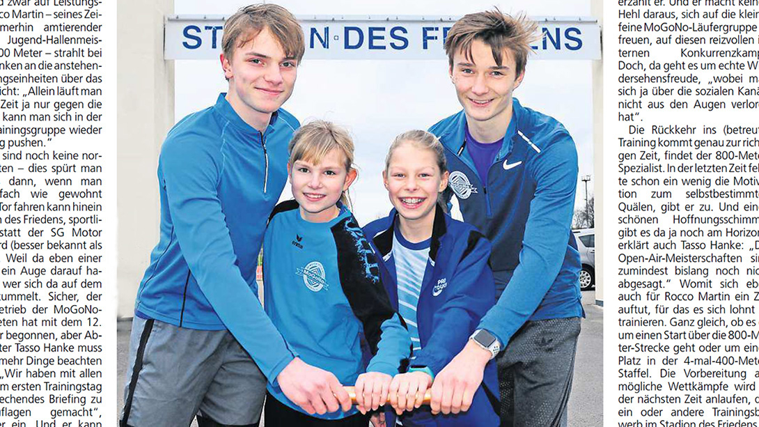 „wobei man sich ja über die sozialen Kanäle nicht aus den Augen verloren hat“. Die Rückkehr ins (betreute) Training kommt genau zur richtigen Zeit, findet der 800-Meter-Spezialist. In der letzten Zeit fehlte schon ein wenig die Motivation zum selbstbestimmten Quälen, gibt er zu. Und einen schönen Hoffnungsschimmer gibt es da ja noch am Horizont, erklärt auch Tasso Hanke: „Die Open-Air-Meisterschaften sind zumindest bislang noch nicht abgesagt.“ Womit sich eben auch für Rocco Martin ein Ziel auftut, für das es sich lohnt zu trainieren. Ganz gleich, ob es da um einen Start über die 800-Meter-Strecke geht oder um einen Platz in der 4-mal-400-Meter-Staffel. Die Vorbereitung auf mögliche Wettkämpfe wird in der nächsten Zeit anlaufen, der ein oder andere Trainingsbewerb im Stadion des Friedens ist bereits geplant. Noch eines kann man konstatieren: Die MoGoNo-Leichtathleten müssen sich bislang keine existenziellen Sorgen machen – man sei ganz gut durch die Krise gekommen, erklärt Tasso Hanke: „Unsere Unterstützer und Sponsoren sind alle nach wie vor an Bord, auch die Athleten bleiben dabei.“ Eine gute Nachricht gab’s für die MoGoNo-Leichtathleten auch schon von der Stadt Leipzig: Der Termin für das 19. Mitgas-Schüler-Hallensportfest wurde bestätigt – der 6. Februar 2021 ist geblockt.