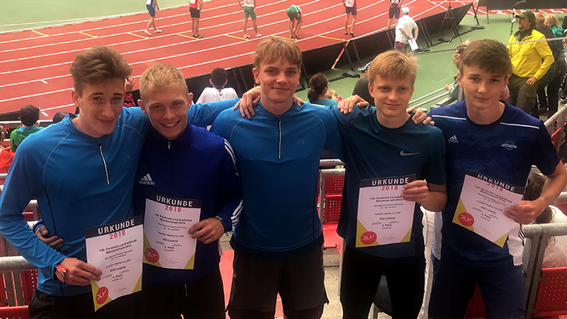 Fünf junge Sportler lagen sich am vergangenen Wochenende bei den Deutschen Leichtathletikmeisterschaften in Nürnberg überglücklich in den Armen. Nach einer sensationellen Leistung in der 4x400m Staffel der MJU 20 mussten sich die Jungs der Startgemeinschaft Leipzig mit den Läufern Rocco Martin (MoGoNo), Niklas Uth (SV Lindenau), Erik Engelhardt (MoGoNo) und Fabian Netscher (MoGoNo) nur knapp geschlagen geben. Aber dieser 4. Platz wurde gefeiert wie ein Sieg, sind doch alle vier Jungs über sich hinaus gewachsen. Hatten die 3 MoGoNo – Sportler doch schon vor Wochenfrist bei den U23 einen glänzenden Eindruck hinterlassen, war es für Niklas Uth sein eigentlich erst zweites Rennen über die Stadionrunde. Hinzu kamen dann noch die Zuschauerkulisse und die Anfeuerungen durch den Stadionsprecher. Auch unser Ersatzläufer Piet Enzmann, er war maßgeblich beteiligt an der Normerreichung für diese Meisterschaften, war bis hin zum Start immer Einsatzbereit.