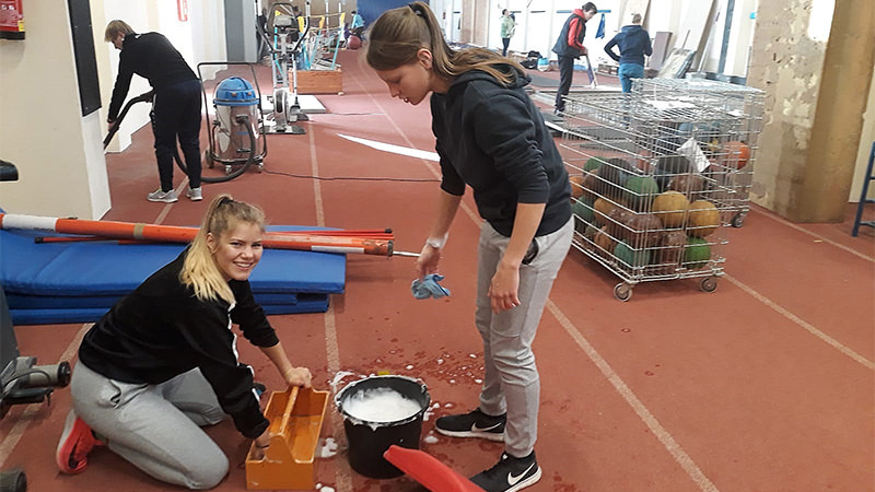 An ihrem wettkampffreien Wochenende trafen sich rund 40 Leichtathleten und Eltern zum „Subbotnik“ im Stadion des Friedens. Unter Leitung von Steffen Wagner wurden die Arbeiten schnell verteilt und dann wurden Schrubber, Besen, Lappen und auch Freischneider und Bohrmaschinen geschwungen, um die anstehenden Arbeiten zu erledigen. Die LA-Halle zeigt sich pünktlich zur Hallensaison wieder in einem sauberen Zustand und die Kraftgeräte können wieder genutzt werden. Der Hallenboden ist gesaugt und die Matten gesäubert.